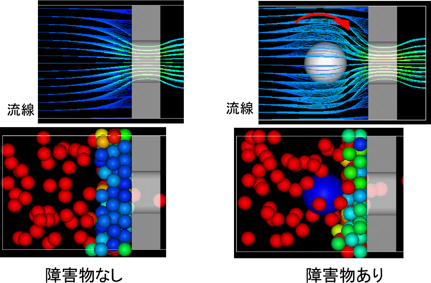 ボトルネックのような急縮小部を通過する粒子の流れにおいて、粉粒体の流れ(固気混相流)と流体駆動粒子の流れ(固液混相流)では流れの様相が異なる。粉粒体の流れにおいては、急縮小部に向かって粒子がV字状に流入するファネルフローは一般的に良く見られる現象である。その一方で、槽内の粉粒体全体を一様に下降しながら流れるマスフローに近づけるため(すなわち整流するため)にボトルネック手前に障害物を挿入する方法が用いられている。例えば、サイロ内の粉体の流れにおいて、一般に粉体はサイロ出口のボトルネック部で詰まる。これを阻止するためにボトルネックの手前にコーン(障害物)を置いて、ボトルネックの閉塞を回避するという方法が前世紀から経験的に採用されている.近年、実験および数値シミュレーションを利用した障害物設置による目詰まり低減や障害物形状の効果に関する研究が行われている。